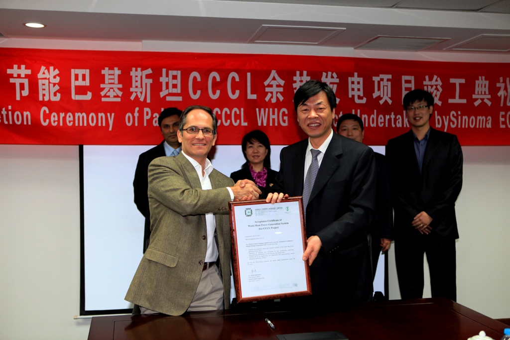 4月20日,中材節(jié)能發(fā)展有限公司董事長張奇代表公司從巴基斯坦CHERAT水泥公司首席執(zhí)行官Azam先生手中接過了余熱電站工程最終接收證書(FAC)。