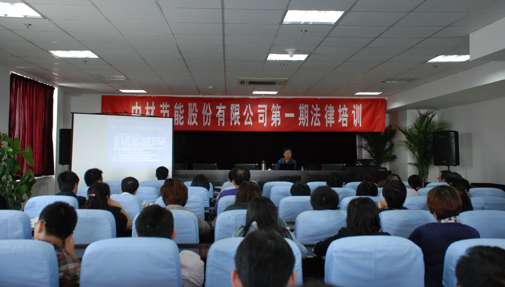 為加強公司管理水平,提高員工風險防范意識,中材節能于2011年5月13日上午組織了第一期法律培訓。公司特邀常年法律顧問花新樂律師作專題講座,公司高管、中層干部及員工共100余人參加培訓。