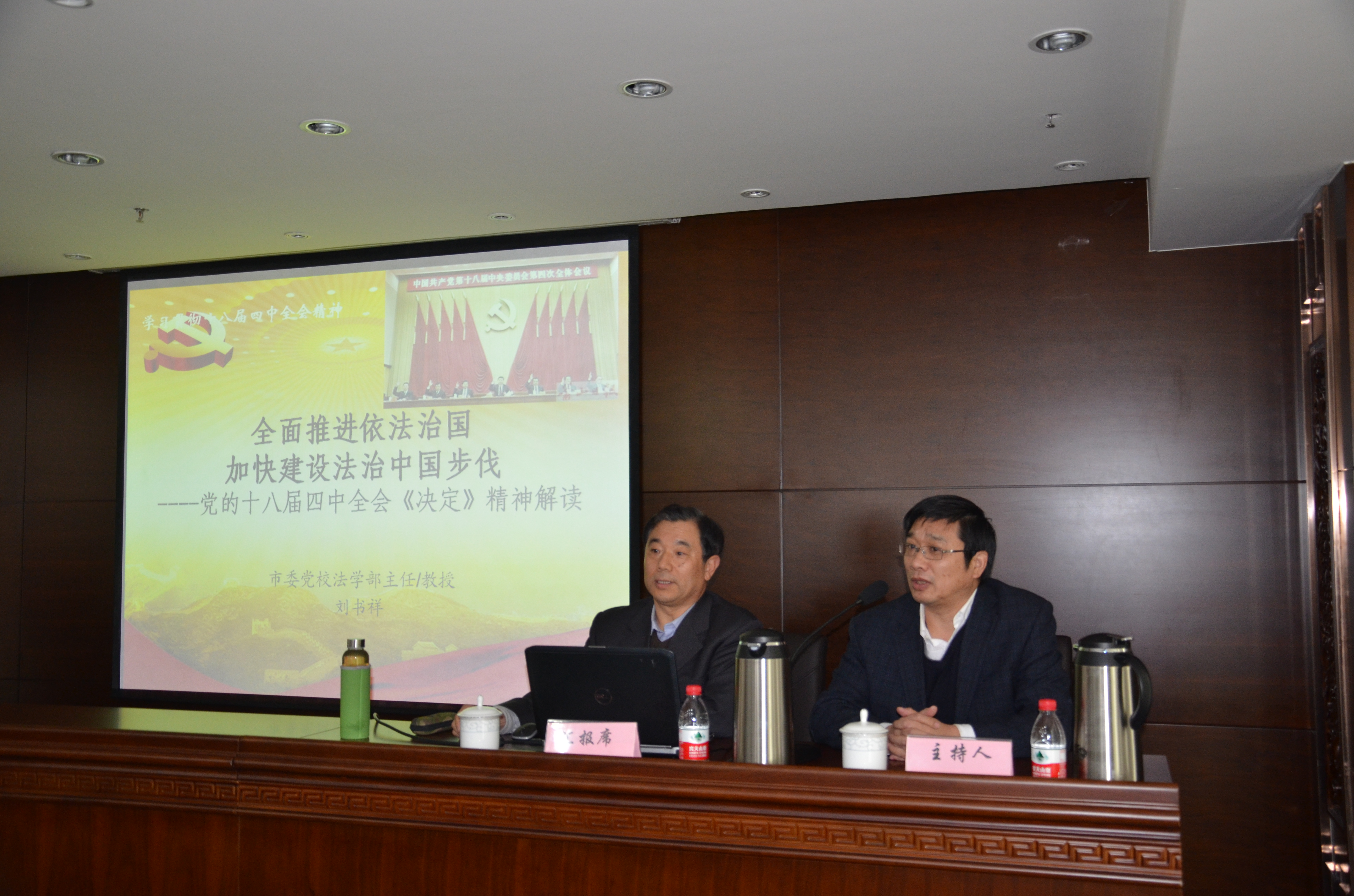 會上,劉書祥教授把黨的十八屆三中全會和四中全會緊密聯系,深入分析了全面推進依法治國與全面深化改革的關系;回顧了我黨依法治國理念的形成和發展,進一步明確了《中共中央關于全面推進依法治國若干重大問題的決定》是黨的法治建設理論與實踐深化的重大成果;從《決定》的重大意義、指導思想、總體目標、基本原則、主要任務入手,進一步闡釋了《決定》的新觀點、新舉措。報告緊扣主題、條理分明、分析透徹,對于各級領導干部全面理解、準確把握四中全會精神進行深入解讀和引領,起到了重要的啟發和推動作用。