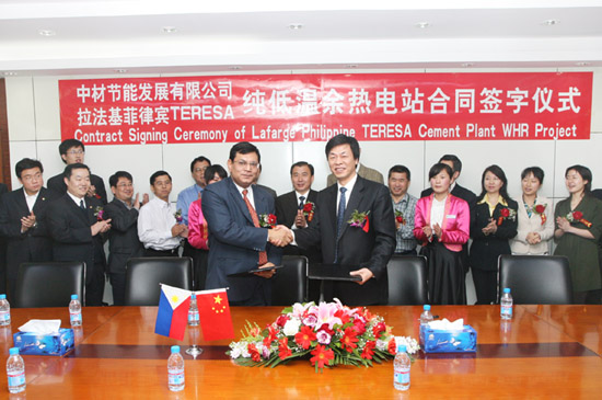April in Beijing,that spring is very much in the air. Sinoma Energy Conservation Ltd. has signed the EP contract with Philippine Lafarge Teresa Cement Company for low-temperature waste heat power generation project since first cooperation with Lafarge Group for its global WHR program at last year. This moment is the first time that Lafarge all adopting Chinese-made WHR system at their overseas plants and it also shows their confidence in WHR power generation technology from Sinoma-EC.